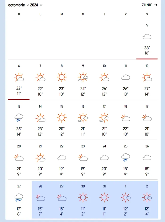 Până spre jumătatea lunii octombrie 2024, temperaturile maxime se vor menține relativ ridicate. Se vor situa între 17 și 27 de grade Celsius. În prima parte a lunii, în București, de exemplu, se vor înregistra temperaturi maxime mai ridicate față de intervalul normal al perioadei. În zilele de 13, 25 și 27 octombrie se vor înregistra precipitații.