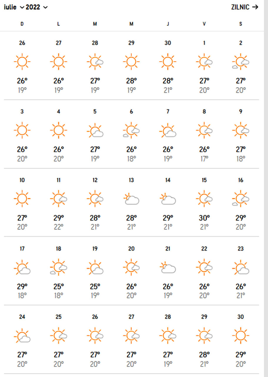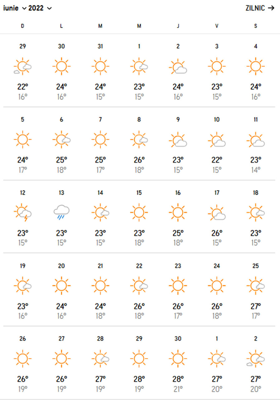 În luna iunie, temperaturile maxime anunțate sunt de 27-28 de grade Celsius, iar cele minime de 22 de grade Celsius. Practic, o vară ideală, fără temperaturi caniculare.