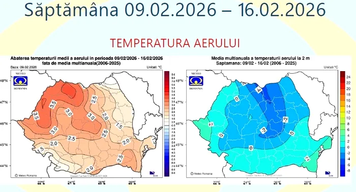 Săptămâna aceasta, până pe 16 februarie 2026, valorile termice vor fi mai ridicate decât cele specifice perioadei pe întreg teritoriul României. Din punct de vedere pluviometric, cantitățile de precipitații vor fi excedentare în sudul și estul țării, iar în celelalte regiuni se vor situa în jurul valorilor normale.
