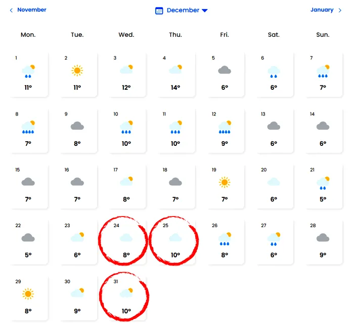 Mai departe, cei de la EaseWeather estimează pentru luna decembrie un deficit de precipitații în perioada sărbătorilor. Dacă în mod normal Bucureștii aveau parte de ploi reci și unele fulguieli, acum intervalul 23-31 decembrie pare că va fi dominat de cer variabil, fără ninsori sau alte precipitații.