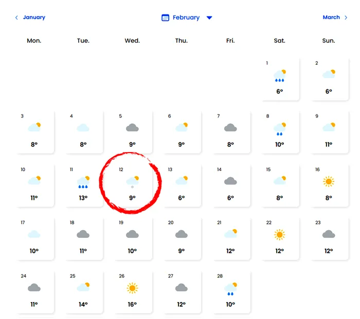 Se pare că ar urma să cadă ceva fulgi peste București în 12 februarie, dată la care meteorologii anticipează, totuși, o temperatură ușor cam ridicată, 9 grade Celsius. De altfel, a doua jumătate a lunii februarie aduce doar temperaturi cu două cifre. Din 17 februarie vom avea 10 grade, chiar și mai mult, 16 grade Celsius, așteptate în 26 februarie.