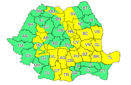Administraţia Naţională de Meteorologie a emis un cod galben de ploi torențiale, furtuni și grindină în mai multe județe din România!