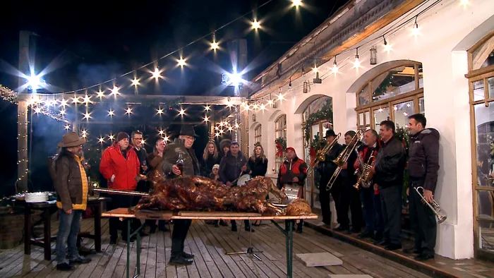Apoi, de la ora 00:00, petrecerea de la Cetate poate începe. Mâncarea-vedetă din farfurie va fi una marca Mircea Dinescu. Pentru că primele ore din an merită sărbătorite cum se cuvine, maestrul propune o reţetă-fenomen: viţelul la proţap, umplut cu purcel fript, umplut cu un curcan ce va fi umplut cu o bibilică.