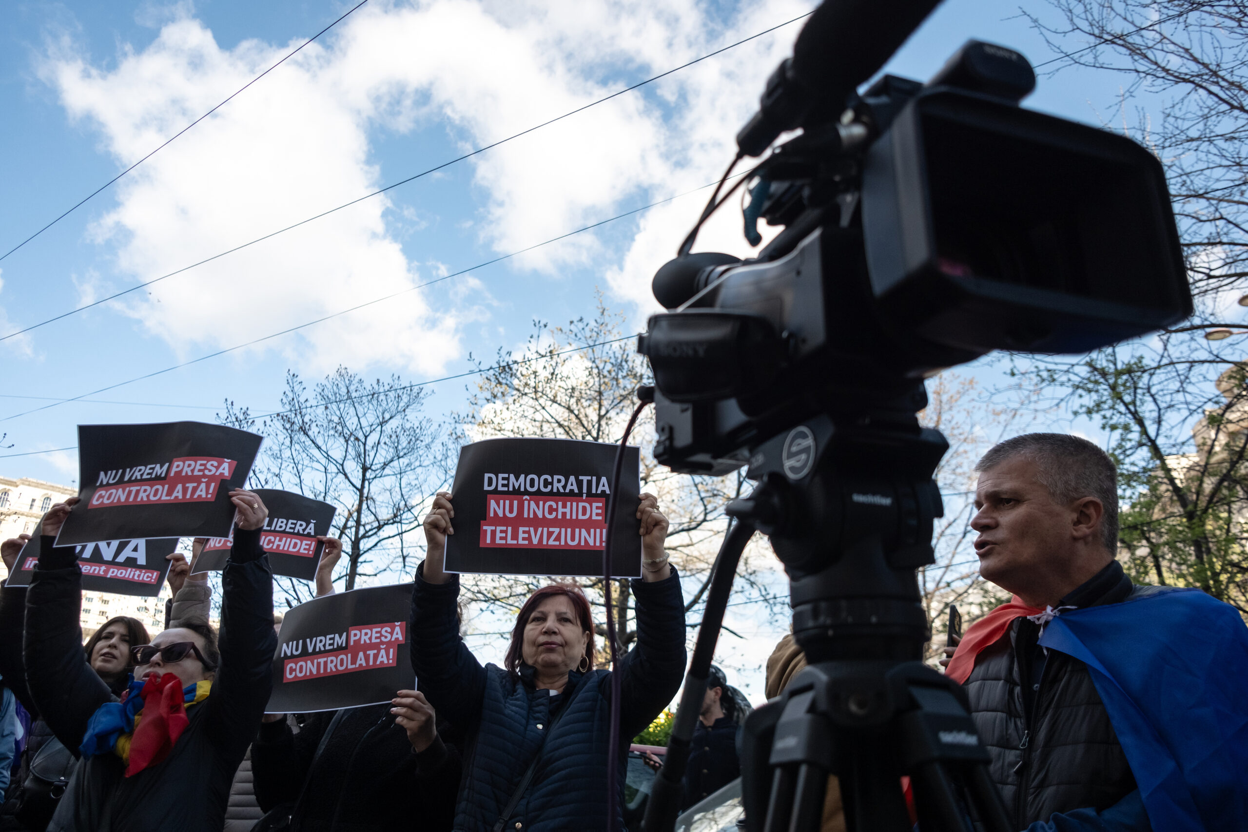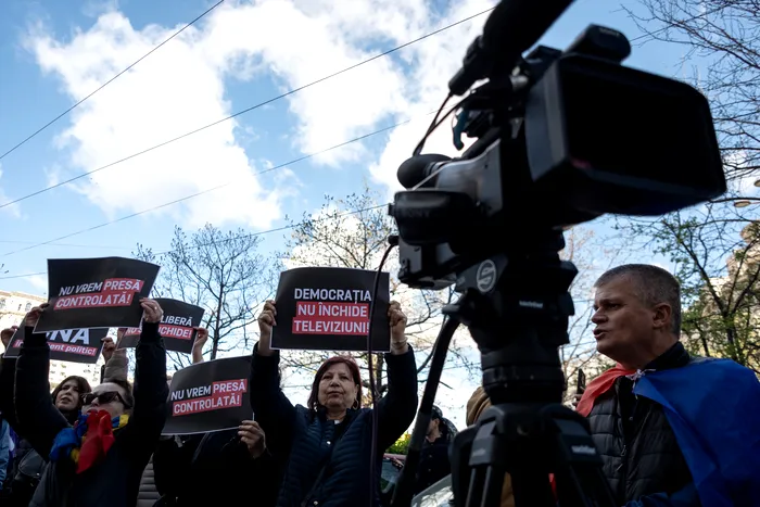 Mai multe persoane protesteaza impotriva Consiliului National al Audiovizualului (CNA), dupa ce aceasta institutie a retras licenta de emisie a postului Realitatea Plus, in Bucuresti, miercuri, 8 aprilie 2026. ALEXANDRU NECHEZ / MEDIAFAX FOTO