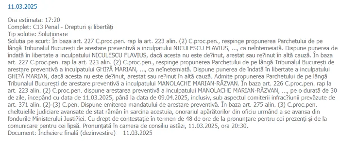 „Respinge propunerea Parchetului de pe lângă Tribunalul Bucureşti de arestare preventivă a inculpatului Niculescu Flavius (…), ca neîntemeiată. Dispune punerea de îndată în libertate a inculpatului N.F., dacă acesta nu este deținut, arestat sau reținut în altă cauză.