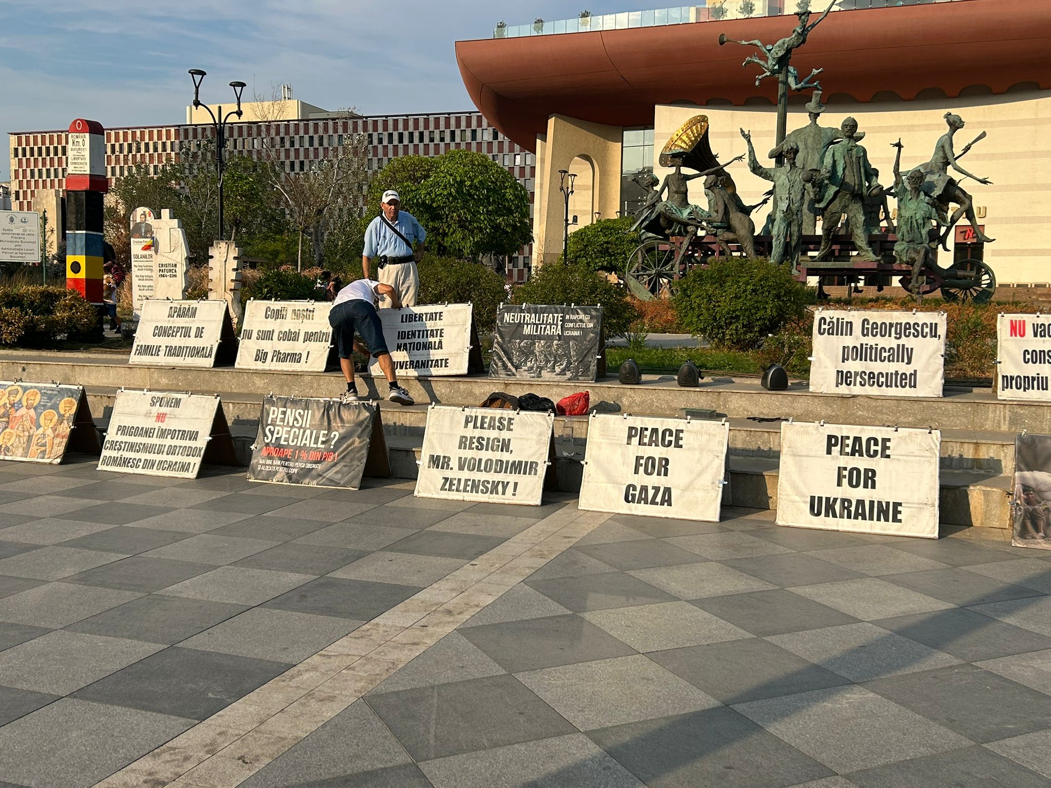 Vizavi, în fața Teatrului Național, sunt stau ordonat așezate aceleași pancarte cu mesaje politice, de la pace pentru Ucraina, la NU vaccinării și persecuția politică a lui Călin Georgescu.