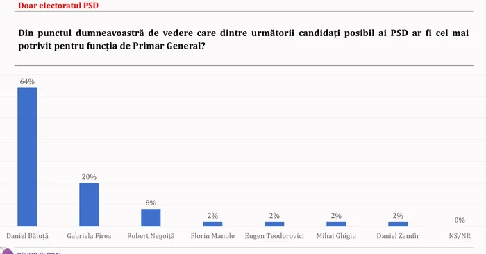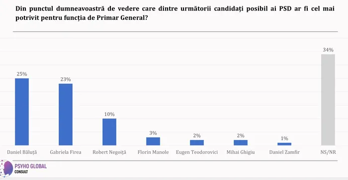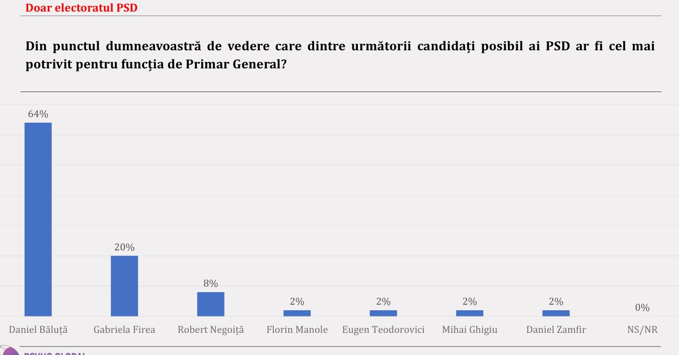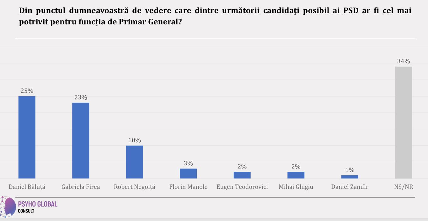 La întrebarea „Din punctul dumneavoastră de vedere care dintre următorii candidați posibil ai PSD ar fi cel mai potrivit pentru funcția de Primar General”, 25% dintre cei chestionați l-au numit pe Daniel Băluță, iar 23% dintre respondenți au spus că Gabriela Firea ar fi potrivită pentru funcția de edil general, în timp ce Robert Negoiță se clasează pe locul 3, cu un scor de 10%.