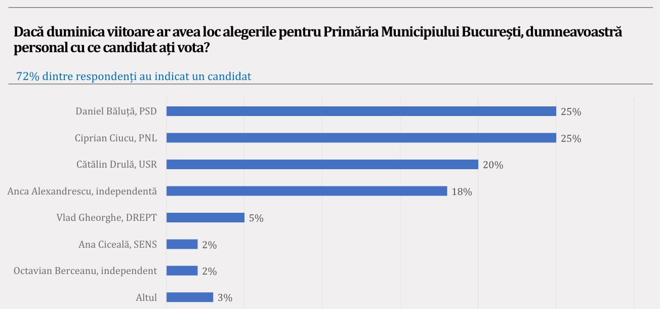De asemenea, la întrebarea „Dacă duminica viitoare ar avea loc alegerile pentru Primăria Municipiului București, dumneavoastră personal cu ce candidat ați vota?”, răspunsurile au fost următoarele:
