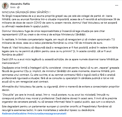 „Pe lângă incapacitatea de a-și asuma propriile greșeli sau pe cele ale colegei de partid, dr. Ioana Mihăilă, care au aruncat România într-o situație imposibilă, aceea de a fi nevoită să achiziționeze 39 de milioane de doze de vaccin COVID de care nu aveam nevoie, domnul Vlad Voiculescu se tot acoperă cu afirmații neadevărate în spațiul public.