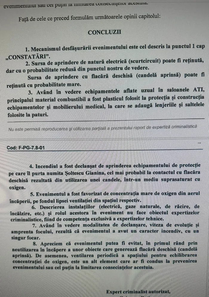 Raportul final de la Înalta Curte de Casație și Justiție cu privire la incendiul de la spitalul din Piatra Neamț arată că incendiul a pornit de la asistenta din salon care manevra o candelă ce a fost adusă la capul unui muribund în secția ATI fără ventilație.