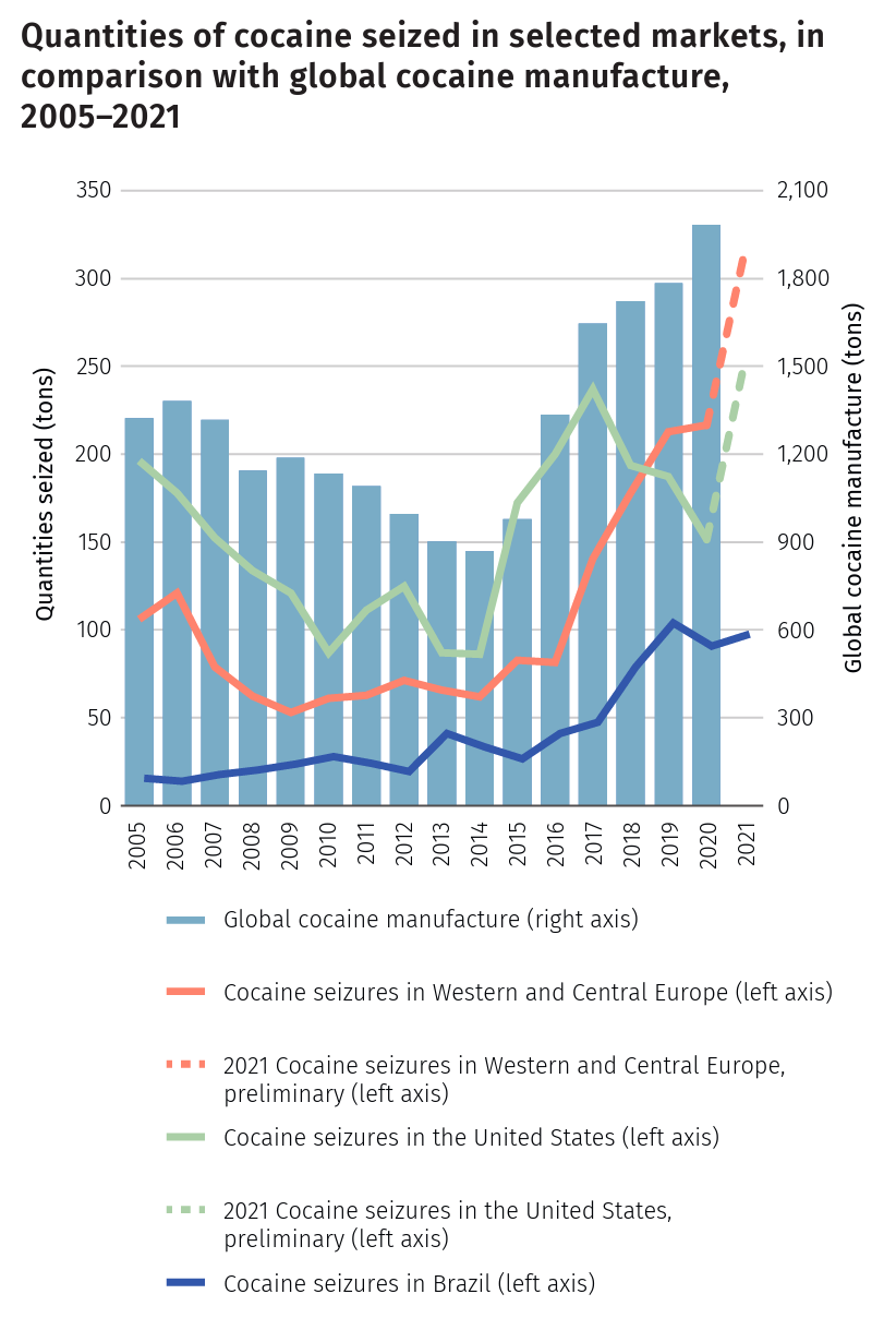 Potrivit aceluiași raport, producția de cocaină la nivel global este la cel mai înalt nivel înregistrat vreodată, arată ONU. Cultivarea frunzei de coca a crescut cu 35% din 2020 până în 2021, un nivel record și reprezintă cea mai semnificativă creștere de la un an la altul din 2016. De asemenea se arată o creștere semnificativă a cantităților de cocaină confiscate de autorități. Zona Europei Centrale și de Est a înregistrat cea mai mare creștere a cantităților de cocaină descoperite.