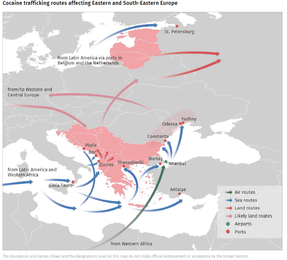 Din datele raportului, rezultă că portul Constanța e folosit tot mai des de traficanții de droguri, iar una din explicațiile pentru creșterea traficului din România e colaborarea constantă între rețelele de crimă organizată, dar și poziția geografică. România se află pe ruta de tranzit Turcia-Grecia spre Europa Occidentală, se arată în Raportul ONU privind traficul și consumul de cocaină din 2023.