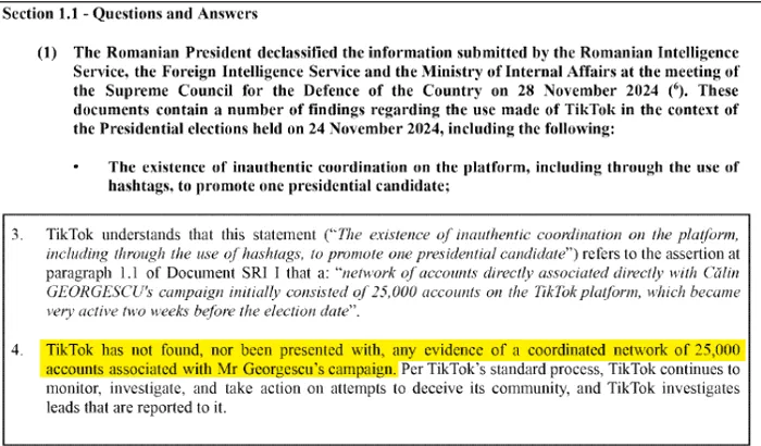 Documentele interne ale TikTok, prezentate ulterior atât autorităților române, cât și Comisiei Europene, contrazic această versiune. Platforma a transmis că nu a găsit dovezi privind existența unei rețele coordonate de zeci de mii de conturi asociate campaniei lui Georgescu.