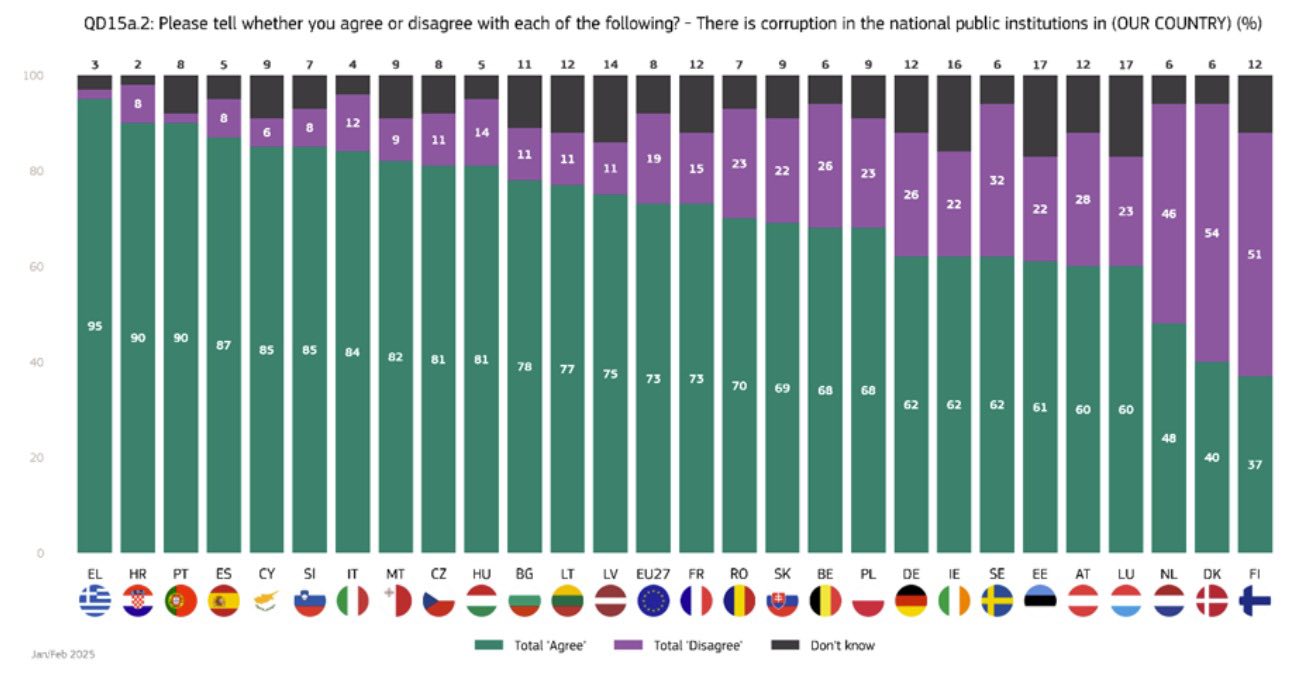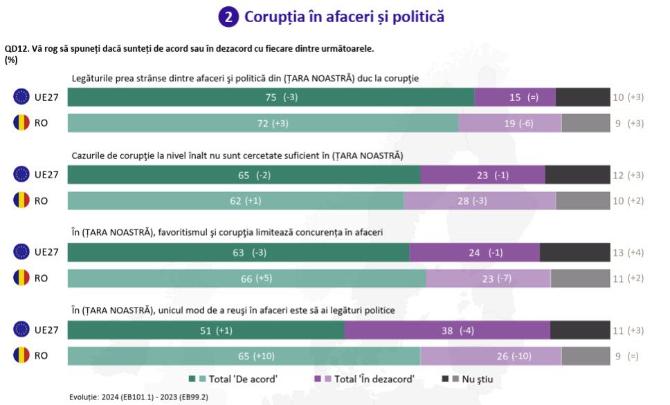 Consiliul remarcă faptul că, potrivit măsurătorilor Eurobarometru, percepția fenomenului corupţiei în anul 2024 era de 71% şi plasa România pe locul 15 din cele 27 de state membre, în grupul ţărilor cu percepție de corupţie medie (51%-75%), în media europeană (71%), procente mai înalte de percepţie a corupţiei regăsindu-se în Grecia (98%), Portugalia (96%), Malta (95%), Slovenia (95%), Croaţia (92%), Cipru (91%), Spania (90%), Ungaria (88%), Bulgaria (85%), Lituania (83%), Cehia (79%), Italia (78%), Slovacia (77%), Letonia (76%).