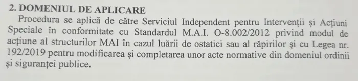 Potrivit Procedurii Operaționale privind modul de acțiune al structurilor Ministerului Afacerilor Interne în cazul luării de ostatici, răpiri de persoane sau a altor fapte grave comise cu arme albe sau de foc, „Procedura se aplică de către Serviciul pentru Intervenții și Acțiuni Speciale în conformitate cu Standardul MAI O-8.002/2012”.