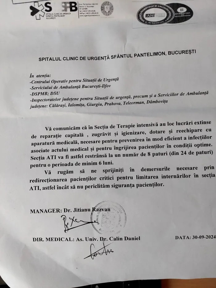 Adresa prin care Spitalul Pantelimon anunță că timp de șase luni va avea doar 8 din cele 24 de paturi din Secția ATI