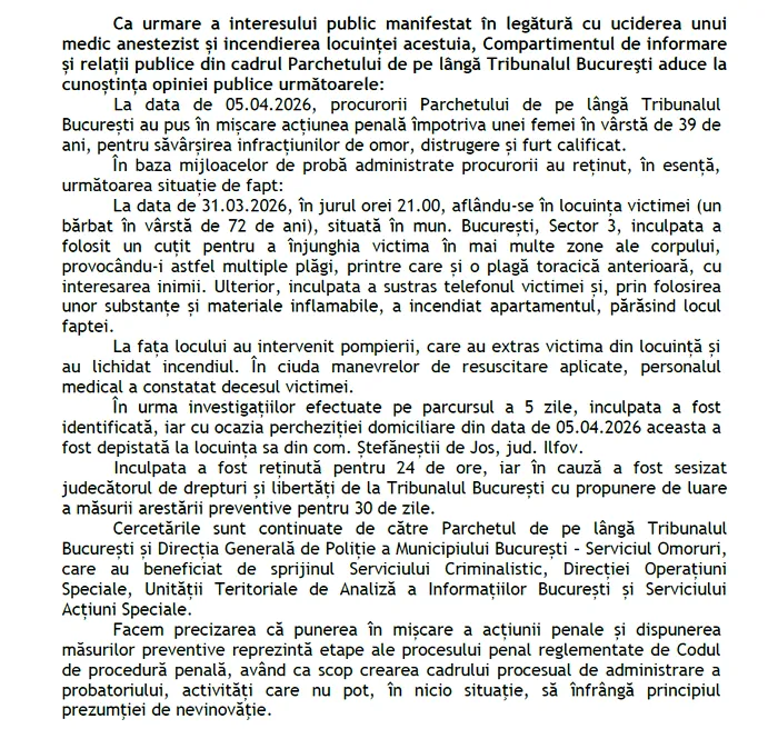 Femeia, care locuia lângă Capitală alături de soțul ei, a explicat anchetatorilor că îl cunoștea pe medic de aproximativ doi ani. Legătura dintre cei doi a început în urma unor anunțuri publicate de victimă, prin care acesta căuta partenere pentru relații intime.