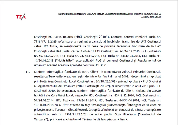 Înțelegem că în ceea ce privește aceste Terenuri, Global Records Group SL a încheiat un contract de vânzare-cumpărare autentificat sub nr. 1902/11.12.2024 de notar public (”Contractul de Vânzare”), prin care a achiziționat Terenurile de la o persoană fizică”, transmit avocații într-un memorandum.