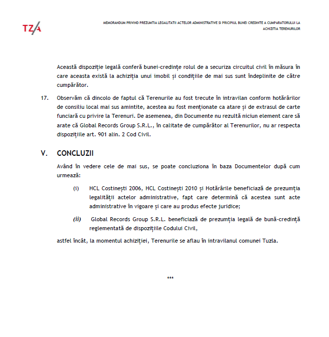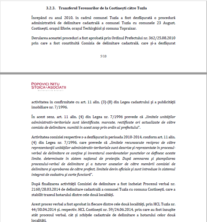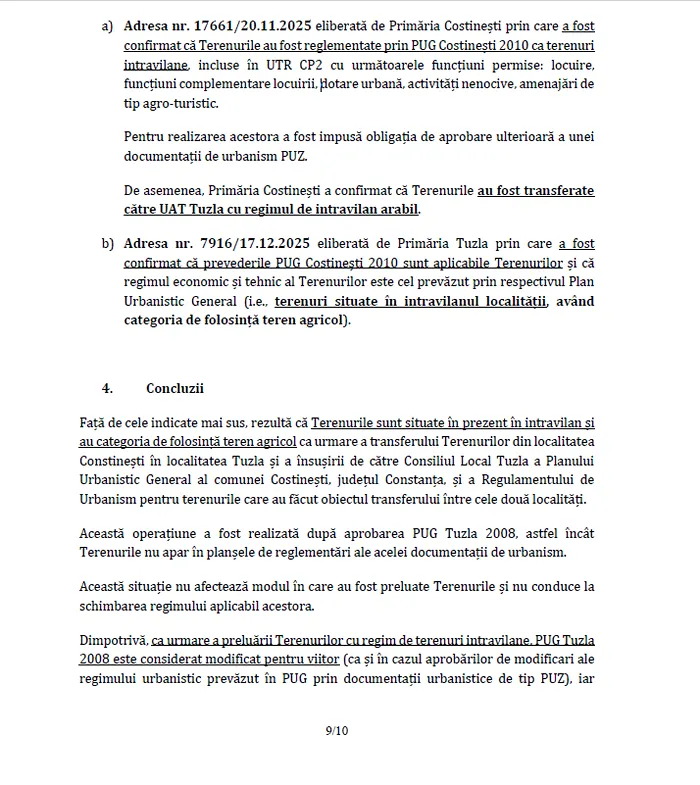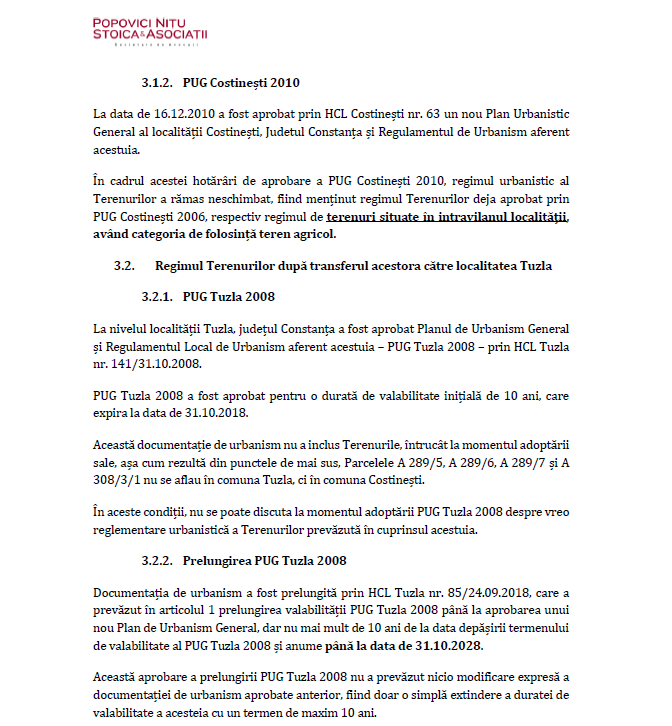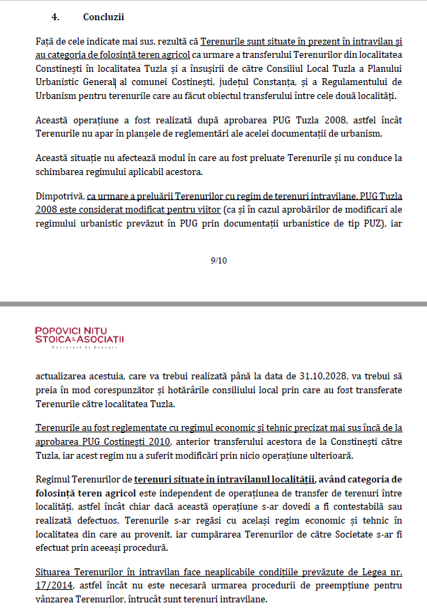 „Terenurile sunt situate în prezent în intravilan și au categoria de folosință teren agricol ca urmare a transferului Terenurilor din localitatea Constinești în localitatea Tuzla și a însușirii de către Consiliul Local Tuzla a Planului Urbanistic General al comunei Costinești, județul Constanța, și a Regulamentului de Urbanism pentru terenurile care au făcut obiectul transferului între cele două localități”, au concluzionat și avocații de la „Popovici Nițu Stoica și Asociații”.