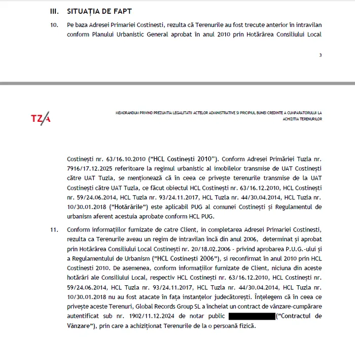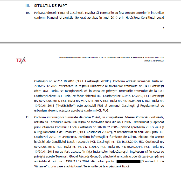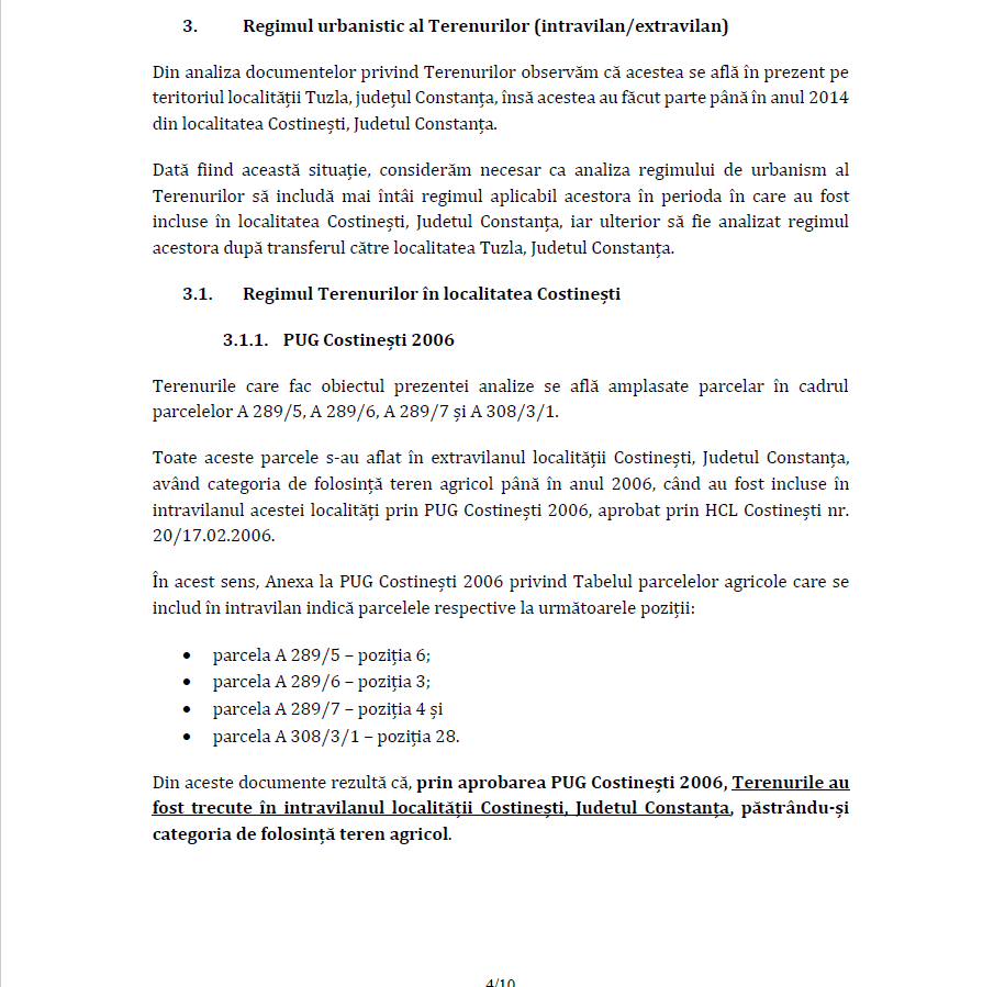Conform informațiilor furnizate de catre Client, in completarea Adresei Primariei Costinesti, rezulta ca Terenurile aveau un regim de intravilan încă din anul 2006, determinat și aprobat prin Hotârârea Consiliului Local Costinești nr. 20/18.02.2006 – privind aprobarea P.U.G.-ului și a Regulamentului de Urbanism (”HCL Costinești 2006”), si reconfirmat în anul 2010 prin HCL Costinesti 2010″, arată „Țuca Zbârcea & Asociații”.