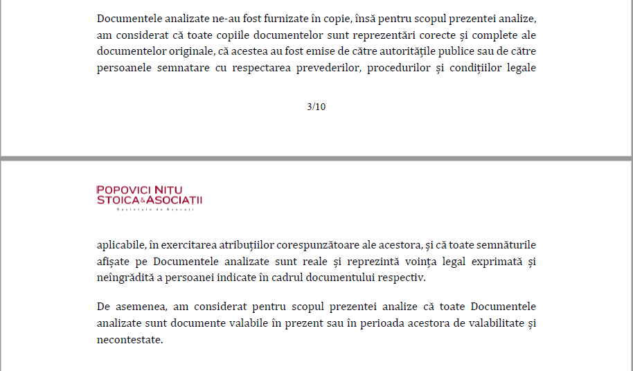 aplicabile, în exercitarea atribuțiilor corespunzătoare ale acestora, și că toate semnăturile afișate pe Documentele analizate sunt reale și reprezintă voința legal exprimată și neîngrădită a persoanei indicate în cadrul documentului respectiv.De asemenea, am considerat pentru scopul prezentei analize că toate Documentele analizate sunt documente valabile în prezent sau în perioada acestora de valabilitate și necontestate”, subliniază avocații de la „Popovici Nițu Stoica și Asociații”.
