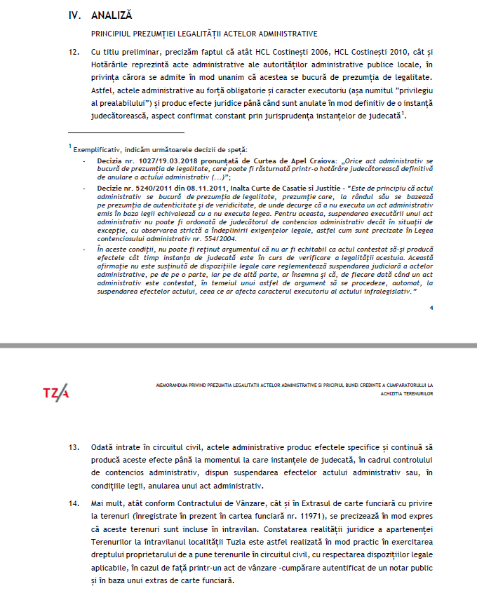 „Cu titlu preliminar, precizăm faptul că atât HCL Costineşti 2006, HCL Costineşti 2010, cât și Hotărârile reprezintă acte administrative ale autorităților administrative publice locale, în privinţa cărora se admite în mod unanim că acestea se bucură de prezumţia de legalitate.
