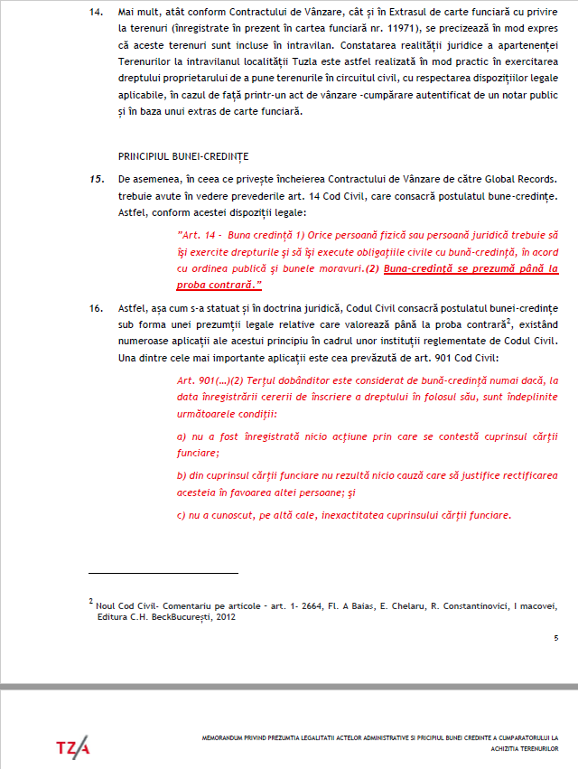 Constatarea realității juridice a apartenenţei Terenurilor la intravilanul localității Tuzla este astfel realizată în mod practic în exercitarea dreptului proprietarului de a pune terenurile în circuitul civil, cu respectarea dispozițiilor legale aplicabile, în cazul de față printr-un act de vânzare-cumpărare autentificat de un notar public și în baza unui extras de carte funciară” mai notează avocații, în exclusivitate pentru Gândul.