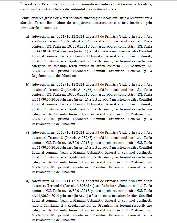 „Pe baza Adresei Primariei Costinesti, rezulta că Terenurile au fost trecute anterior în intravilan conform Planului Urbanistic General aprobat în anul 2010 prin Hotărârea Consiliului Local.