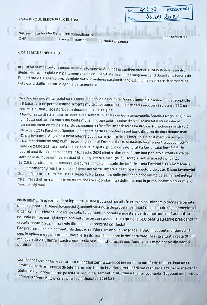 Fac precizarea că am formulat o contestație și la BEC în data de 30.09.2024 cu nr. 44CTBEC/SCD2024, cu ocazia depunerii semnăturilor de către partidul S.O.S. România și a Dianei Iovanovici-Șoșoacă în vederea susținerii candidaturilor sus-menționate, pe care o anexez la prezenta.