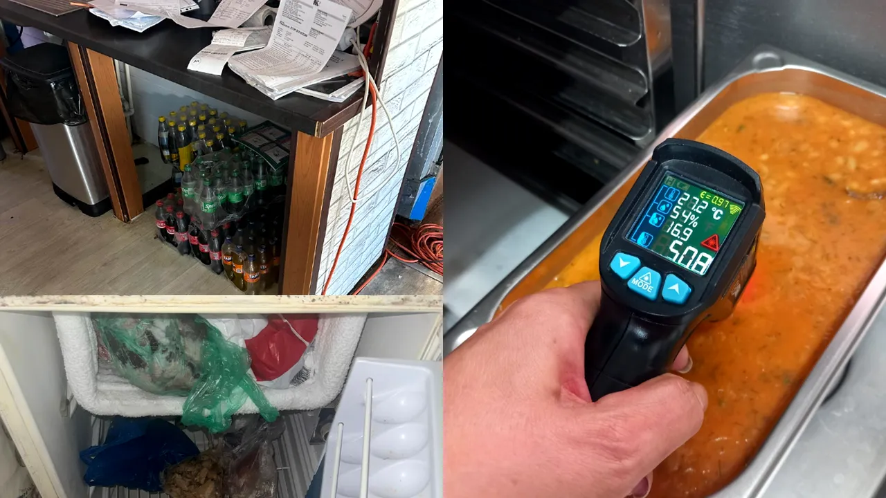 • Spații neigienizate/ustensile de gătit neconforme, materii prime fără elemente de identificare, materii prime depozitate necorespunzător, agregate frigorifice neigienizate, scurgător pahare negienizat, dozator bere necurățat, băuturi răcoritoare la bar depozitate direct pe paviment;