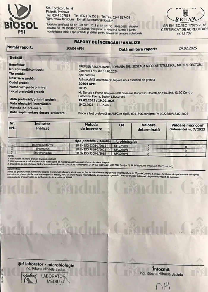 Buletinele de analiză ale gheții produsă în aparatul restaurantului McDonald’s din Mall Băneasa, prezentate de reprezentanții firmei organelor de control ale ANPC, arată că „gheața este conformă”.