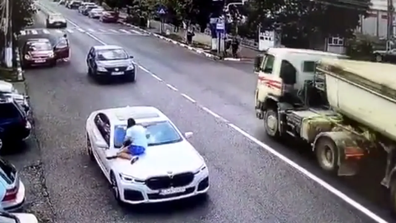 Pe imagini se vede cum soția înșelată se urcă pe capota automobilului și încearcă să-i împiedice pe cei doi să plece. Totodată, ea vrea să intre peste bărbat în mașină, însă fără succes, potrivit cronica-gaestiului.ro