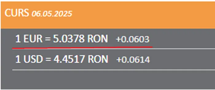 Luni, 5 mai, euro era cotat, potrivit BNR, la 4.9775 lei, iar cu o zi înainte, cursul anunțat era de 4,9773 lei.