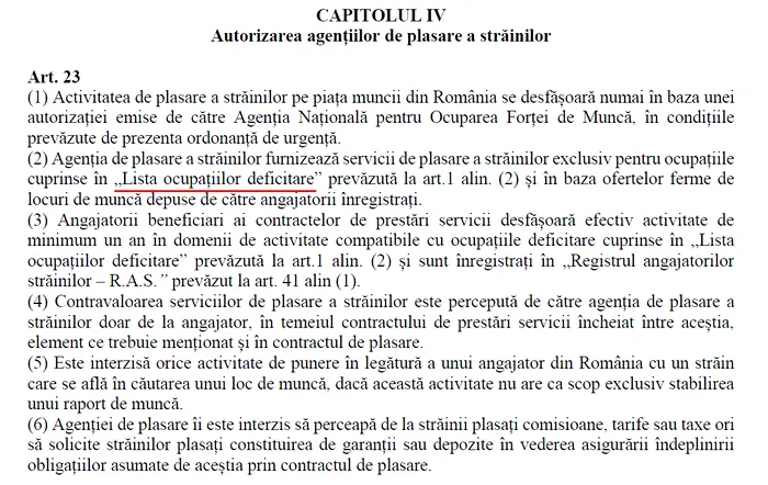 Conform noii reglementări, Guvernul vrea să autorizeze agenții de recrutare care să preia atribuții extinse de monitorizare și gestiune a muncitorilor străini. Problema principală ridicată de specialiști este „răspunderea disproporționată”. Companiile au dreptul de a-și aduce singure angajați din țări precum Indonezia sau Nepal, cum ar fi, de exemplu, un transfer de la o filială la alta. Totuși, dacă un astfel de muncitor ajunge în România și alege ulterior să plece ilegal spre alte state UE, proiectul de OUG prevede sancționarea recrutorilor în loc să tragă la răspundere direct companiile beneficiare.