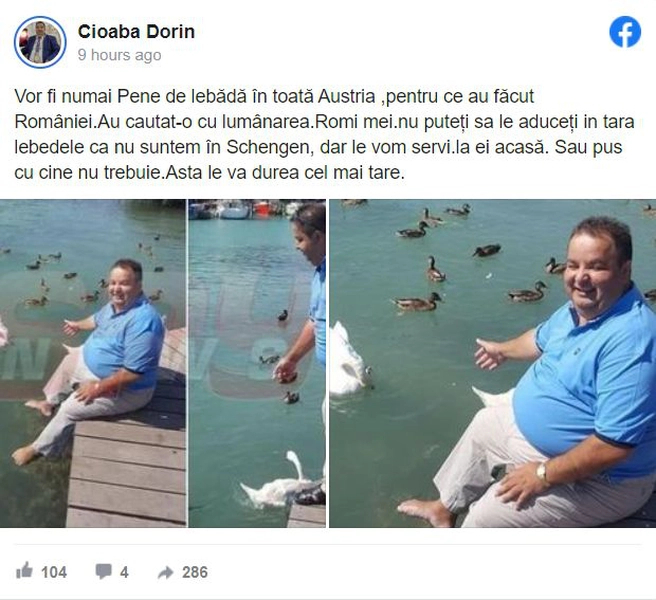 „Vor fi numai pene de lebădă în toată Austria, pentru ce au făcut României. Au căutat-o cu lumânarea. Romii mei, nu puteți să le aduceți în țară lebedele că nu suntem în Schengen, dar le vom servi la ei acasă. S-au pus cu cine nu trebuie. Asta le va durea cel mai tare”, a scris Dorin Cioabă pe Facebook.