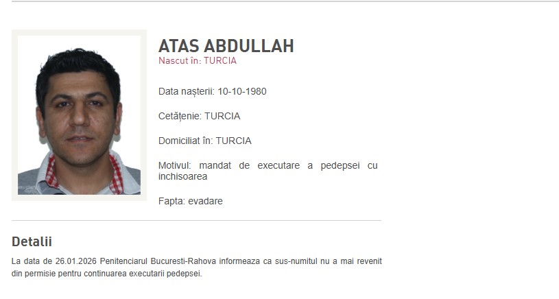 Încarcerat în Penitenciarul Rahova pentru 22 de ani și 10 luni, după ce Curtea de Apel București l-a condamnat definitiv, în 2017, Abdullah Atas,un cetățean de naționalitate turcă, încarcerat pentru săvârșirea infracțiunii de omor, nu a mai revenit în penitenciar, după ce a beneficiat de permisie în perioada 23-26.01.2026.