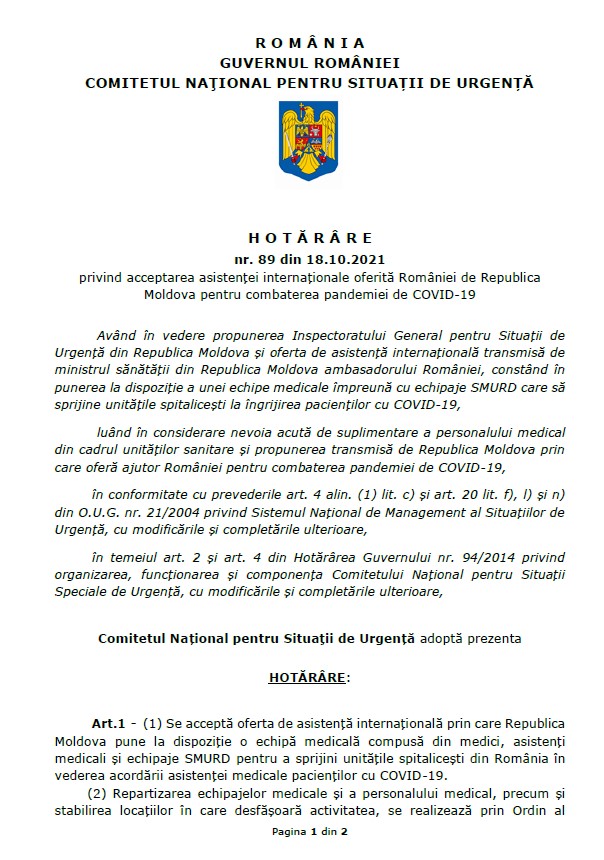 CNSU a aprobat, luni, printr-o hotărâre, oferta de asistenţă internaţională prin care Republica Moldova pune la dispoziţie o echipă medicală pentru a sprijini unităţile spitaliceşti din România în vederea tratării pacienţilor cu COVID-19.