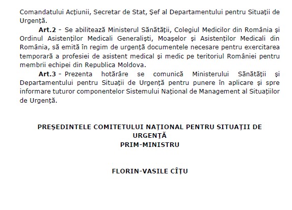 Prin aceeaşi hotărâre, Ministerul Sănătăţii, Colegiul Medicilor din România şi Ordinul Asistenţilor Medicali Generalişti, Moaşelor şi Asistenţilor Medicali din România sunt abilitate să emită în regim de urgenţă documentele necesare membrilor echipei din Republica Moldova pentru a putea lucra temporar în România.