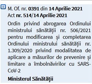 „Ordinul Ministrului Sănătăţii nr. 506/2021 pentru modificarea şi completarea Ordinului ministrului Sănătăţii nr. 1.309/2020 privind modalitatea de aplicare a măsurilor de prevenire şi limitare a îmbolnăvirilor cu SARS-CoV-2, publicat în Monitorul Oficial al României, partea 1, nr. 382, din 13 aprilie 2021, se abrogă”, scrie în Monitorul Oficial al României, partea I. A semnat pentru abrogare ministrul interimar al Sănătăţii, Florin Cîţu.