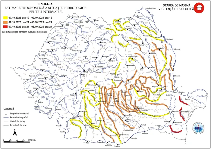 Un Cod Roșu de inundații este în vigoare pentru râurile din județele Constanța și Tulcea, în intervalul 7 octombrie, ora 21 – 8 octombrie, ora 24.