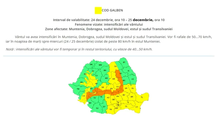 ANM a emis cod portocaliu în intervalul 24 decembrie, ora 10:00 – 25 decembrie, ora 10:00. Zone afectate și fenomene vizate: ninsoare abundentă, depunere de strat de zăpadă și viscol puternic la altitudini în general de peste 1700 m în Carpații Meridionali și local în Carpații Orientali.