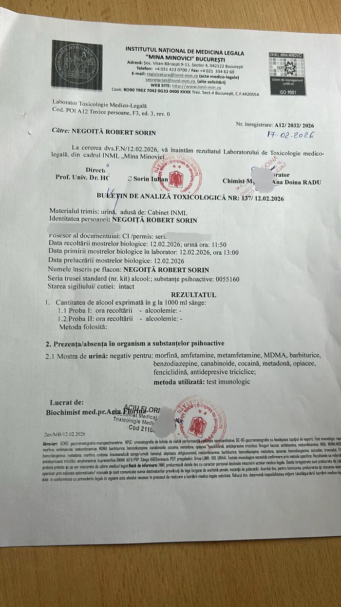 Robert Negoiță a primit un rezultat negativ pentru consum de cocaină, în urma analizelor efectuate la Institutul de Medicină Legală.