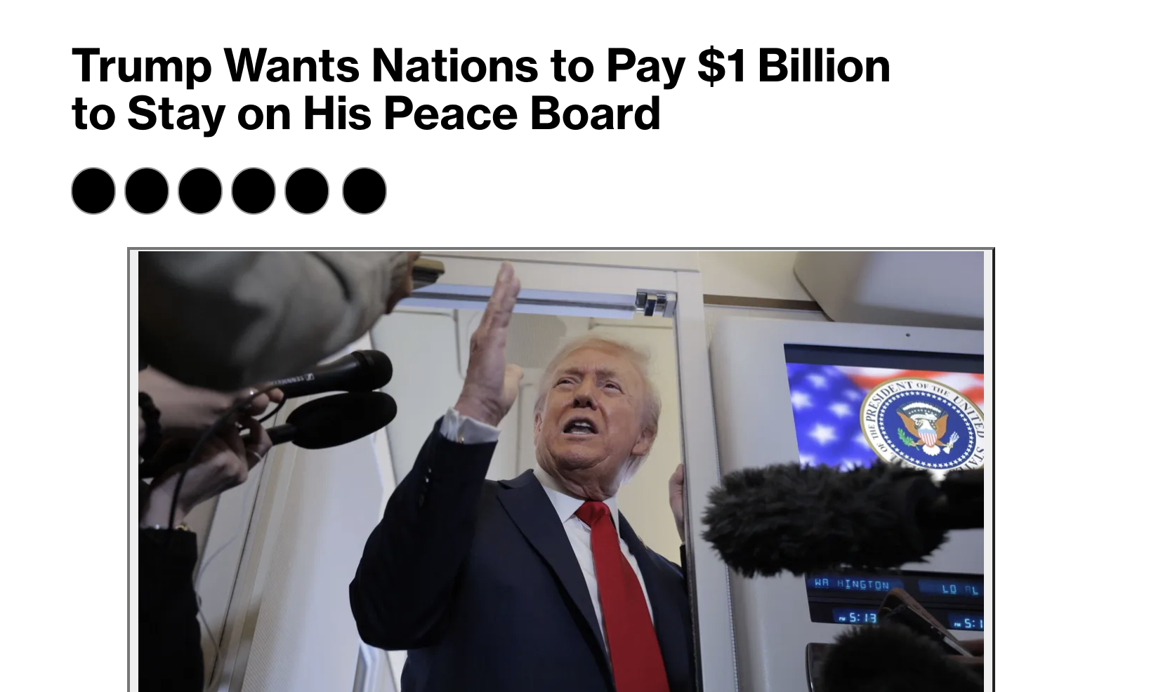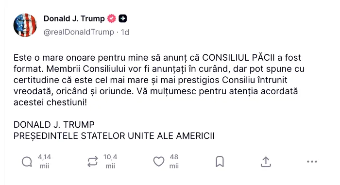 Administrația Trump solicită țărilor care doresc un loc permanent în noul său Consiliu al Păcii să contribuie cu cel puțin 1 miliard de dolari, dezvăluie în această seară publicația Bloomberg.