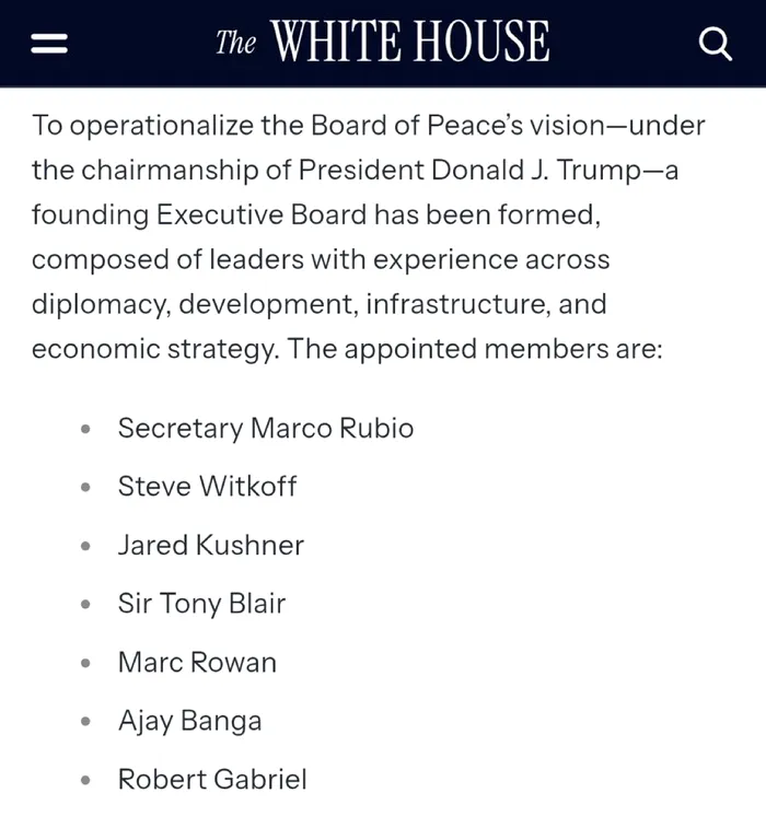 Vineri, Casa Albă a anunțat un prim grup executiv care îi va include pe secretarul de stat Marco Rubio, trimisul pentru Orientul Mijlociu Steve Witkoff, ginerele lui Trump, Jared Kushner, și fostul prim-ministru al Marii Britanii, Tony Blair, înainte de formarea consiliului general.