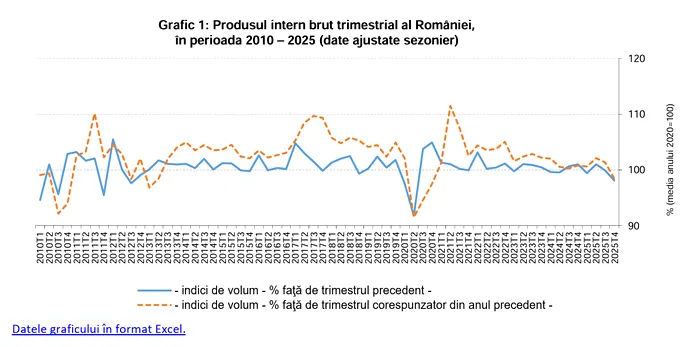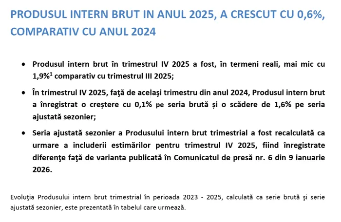 Potrivit datelor publicate de Institutul Național de Statistică, PIB-ul din trimestrul IV 2025 a fost mai mic cu 1,9% față de trimestrul III. În trimestrul III, economia scăzuse deja cu 0,2% comparativ cu trimestrul II.