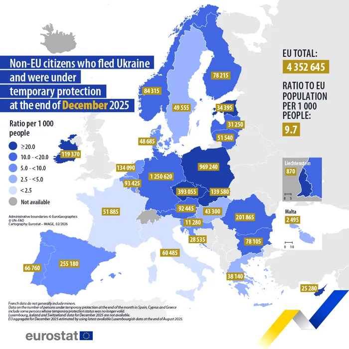 La 31 decembrie 2025, un total de 4,35 milioane de cetățeni non-UE care au fugit dinUcraina au avut statut de protecție temporară în UE.
