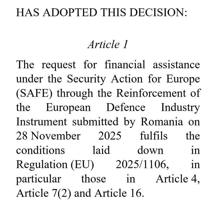 Decizia vine ca urmare a unei evaluări riguroase a „planurilor naționale de investiții în domeniul apărării” ale țărilor în cadrul inițiativei „Acțiunea de securitate pentru Europa” (SAFE).