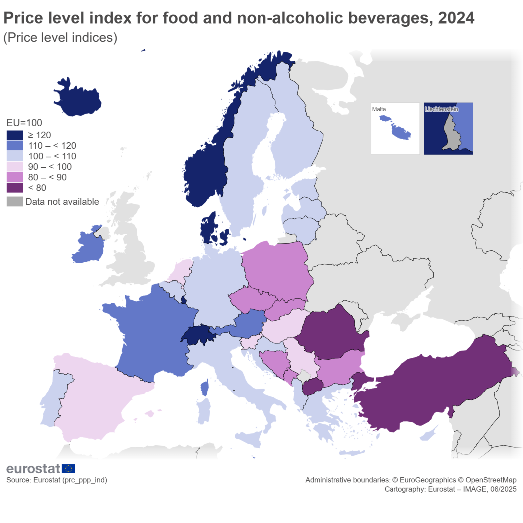 În datele pe 2024 ale Eurostat, România este cea mai ieftină țară din UE la nivelul prețurilor alimentelor, cu un coș evaluat la aproximativ 74,6 euro dacă media UE este 100. Cu alte cuvinte, alimentele sunt cu circa 25% mai ieftine decât media europeană, cel puțin ca nivel nominal al prețurilor.