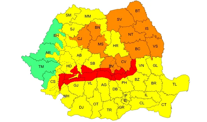 ANM anunță că aproape toată țara se află sub incidența codurilor galbene, portocalii și roșii (harta, mai jos).