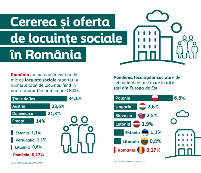 În Europa Centrală și de Est, situația este net mai bună. În Polonia, locuințele sociale reprezintă 6,6% din fondul locativ, iar în Lituania, 0,8%. Diferențele devin și mai evidente în Europa de Vest, unde Olanda are peste o treime din locuințe în regim social (34,1%), iar Finlanda aproape 11%.